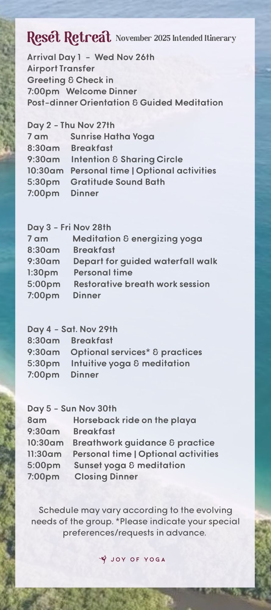 *Note: Additional optional activities, like surfing, massages or 1:1 coaching can be arranged and pre-booked. These are not included in the retreat pricing. Inquire when booking.
